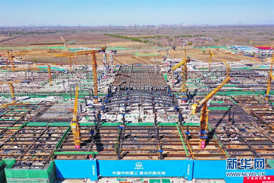 这是3月27日拍摄的京雄城际铁路雄安站施工现场(无人机照片)。新华社记者杨世尧摄