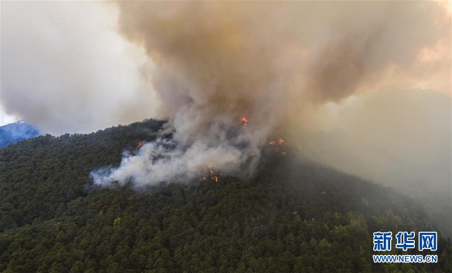 这是3月31日在四川省凉山州西昌市泸山拍摄的森林火灾现场(无人机照片)。新华社记者王曦摄