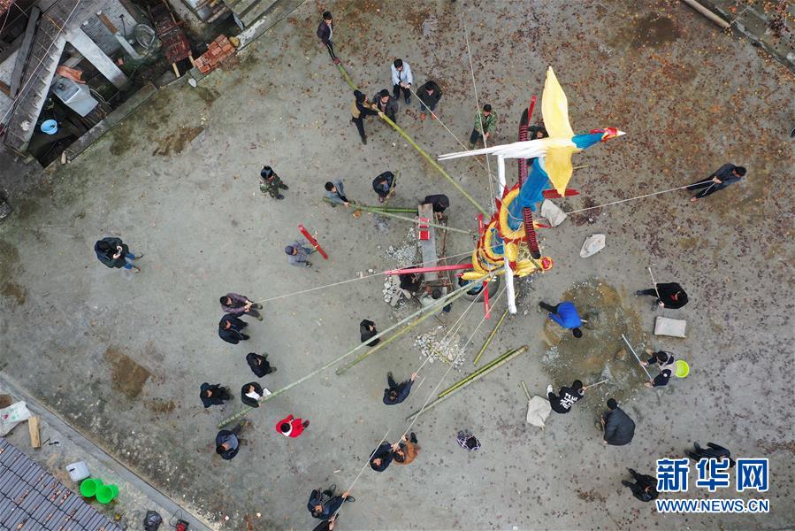 乌英苗寨的村民在立新芦笙柱(12月22日无人机拍摄)。