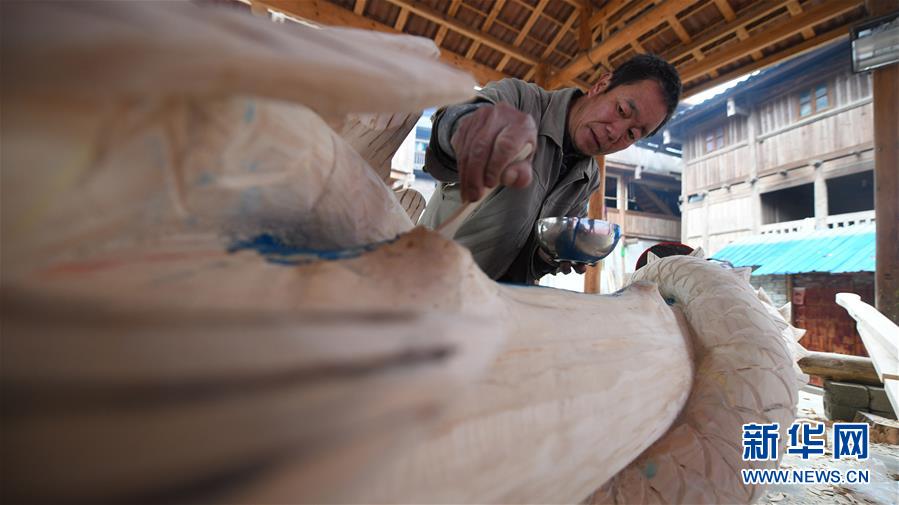 乌英苗寨村民梁秀金给新芦笙柱涂油漆(12月20日摄)。新华社记者黄孝邦摄