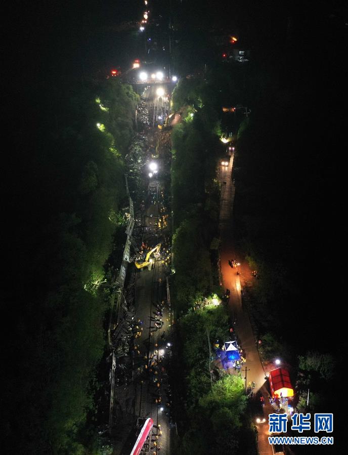 3月30日晚,工程机械在京广铁路郴州段脱轨事故现场作业(无人机照片)。新华社记者李尕摄