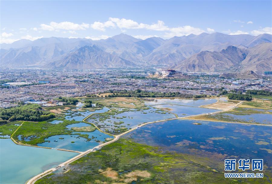 蓝天白云和绿水之间的布达拉宫(6月5日摄)。新华社记者觉果摄