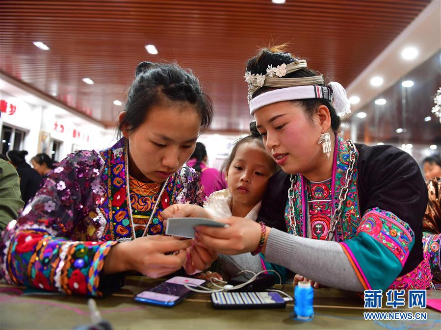 村民在广西融水苗族自治县易地扶贫安置点苗家小镇“妇女之家巾帼扶贫车间”学习刺绣(2019年11月18日摄)。新华社记者黄孝邦摄