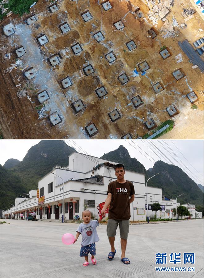 拼版照片:上图为位于广西都安瑶族自治县大兴镇的正在施工建设的敢皓易地扶贫搬迁安置新区(2017年7月26日摄);下图为居民在广西都安瑶族自治县大兴镇敢皓易地扶贫搬迁安置新区散步(2019年10月16日摄)。新华社记者陆波岸摄