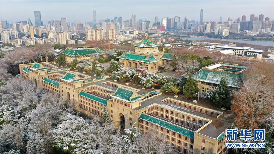 这是2月16日拍摄的雪后的武汉大学樱园和老图书馆,与远处的武汉城市楼群相映成景(无人机照片)。2月15日,武汉迎来一场降雪。2月16日清晨,雪后初霁,阳光洒在武汉大学的建筑群上,景色如画。新华社记者陈晔华摄