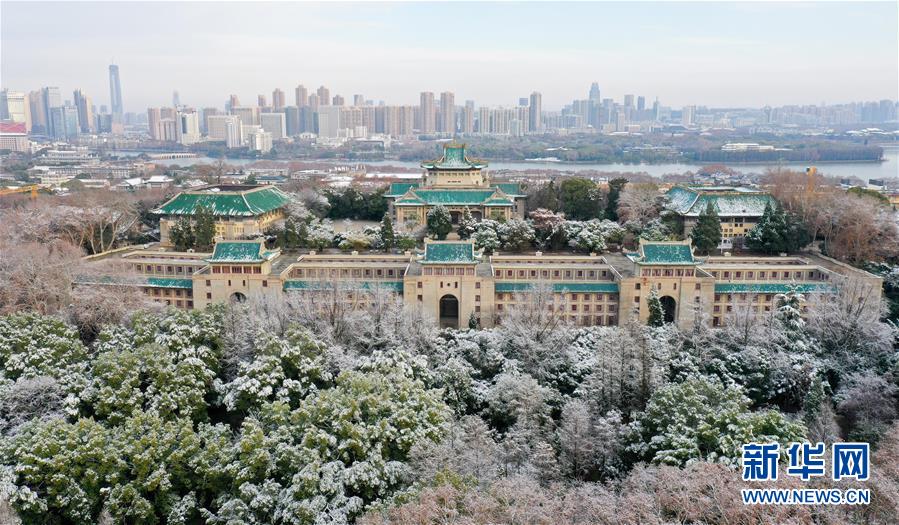 这是2月16日拍摄的雪后的武汉大学樱园和老图书馆(无人机照片)。新华社记者陈晔华摄