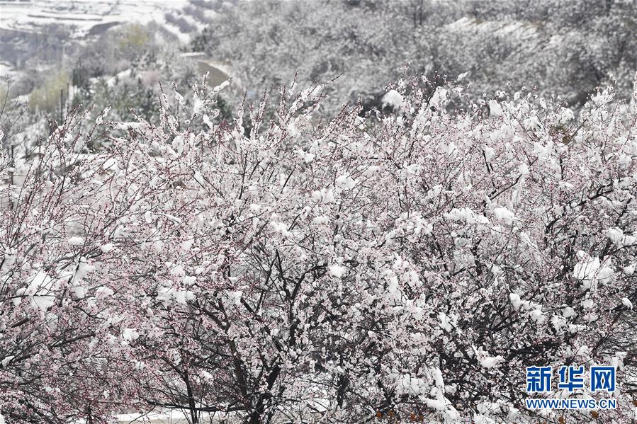 这是宁夏彭阳县金鸡坪梯田公园雪中的桃花(4月1日摄)。新华社记者王鹏摄
