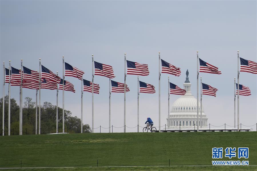 4月1日,在美国首都华盛顿,一名男子从美国国旗前骑车经过。
