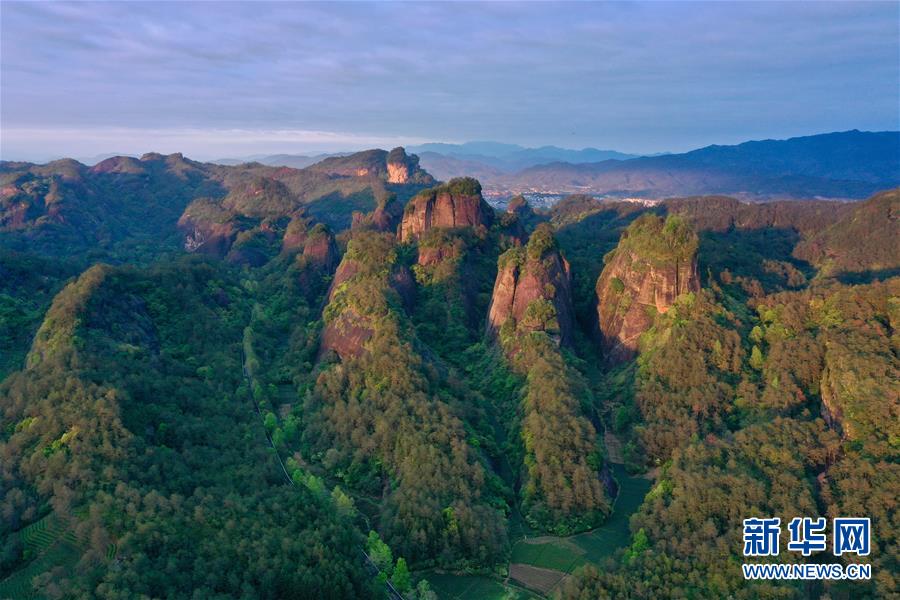 这是夕阳照射下的武夷山国家公园丹霞群峦(4月1日摄,无人机照片)。 新华社记者 姜克红 摄