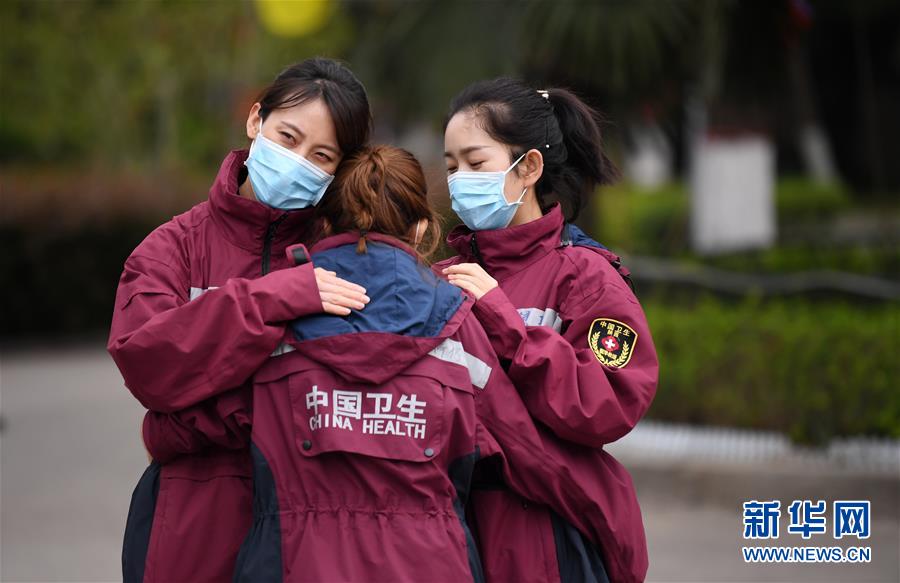 4月3日,陕西医疗队队员拥抱告别。 当日,陕西省第一批援鄂医疗队137名队员在陕西省工人疗养院结束了为期两周的隔离休养。医疗队员与“战友”深情作别后,陆续踏上归途。 新华社记者 李一博 摄