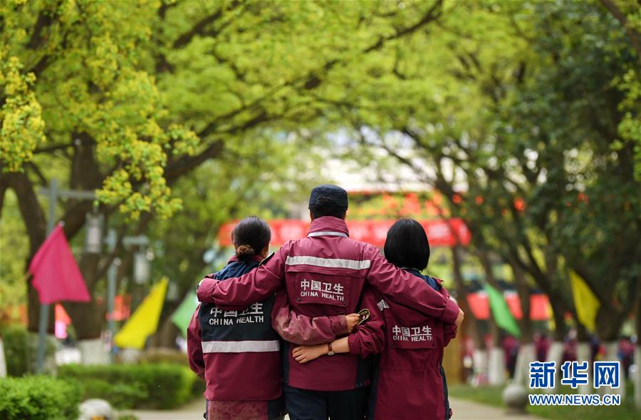 4月3日,陕西省第一批援鄂医疗队队长易智(中)安慰离别的队员。 当日,陕西省第一批援鄂医疗队137名队员在陕西省工人疗养院结束了为期两周的隔离休养。医疗队员与“战友”深情作别后,陆续踏上归途。 新华社记者 李一博 摄