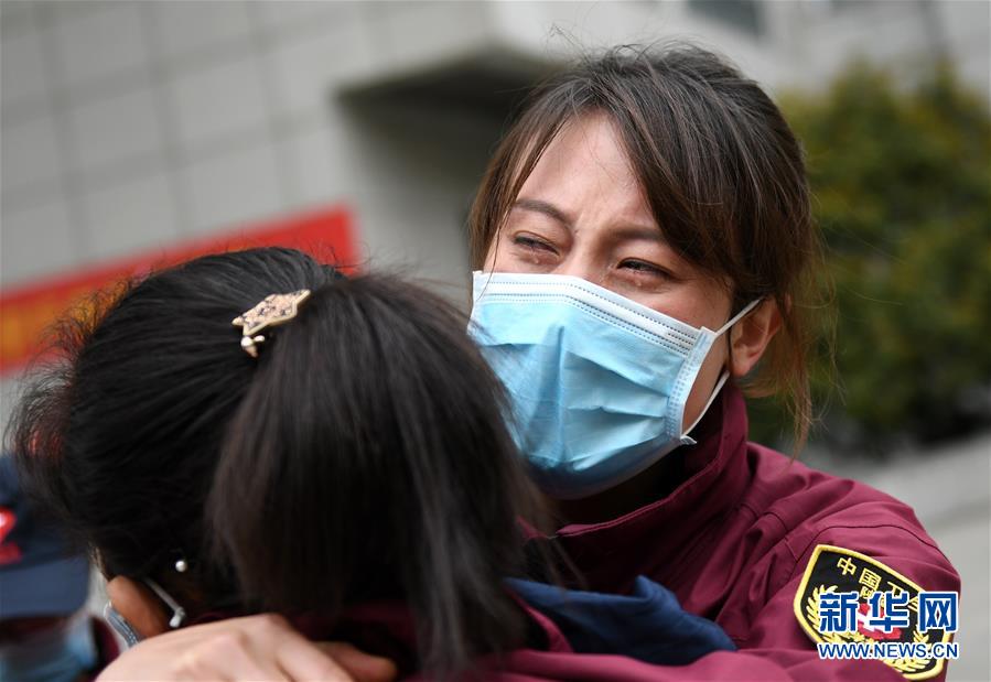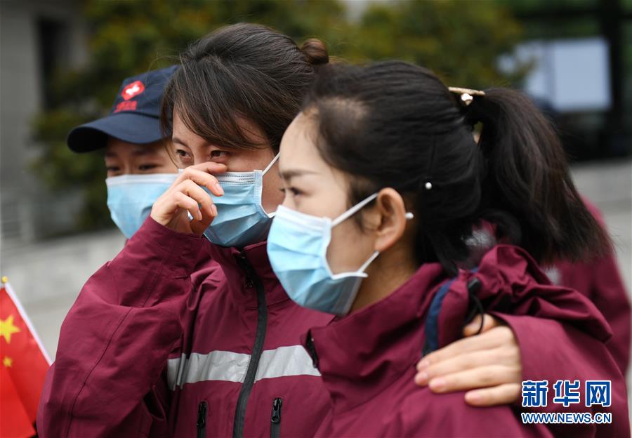 4月3日,来自西安交通大学第一附属医院的医疗队队员王沙沙(前)在送别“战友”后落泪。 当日,陕西省第一批援鄂医疗队137名队员在陕西省工人疗养院结束了为期两周的隔离休养。医疗队员与“战友”深情作别后,陆续踏上归途。 新华社记者 李一博 摄