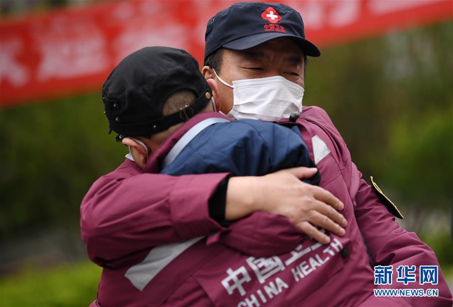 4月3日,陕西省第一批援鄂医疗队队长易智(右)和队员拥抱作别。 当日,陕西省第一批援鄂医疗队137名队员在陕西省工人疗养院结束了为期两周的隔离休养。医疗队员与“战友”深情作别后,陆续踏上归途。 新华社记者 李一博 摄