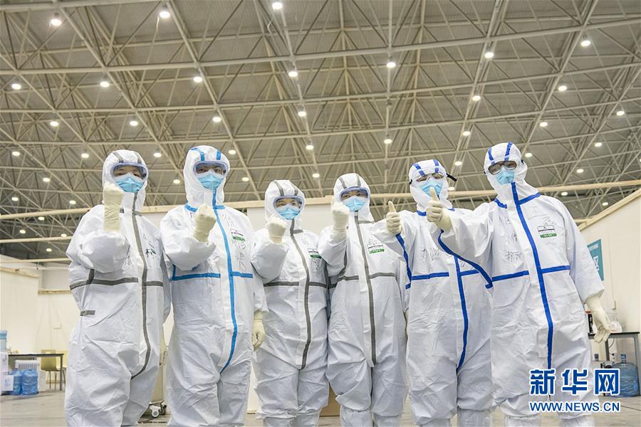 2月10日,在武汉客厅方舱医院,几名医护人员为自己打气。 新华社记者 熊琦 摄