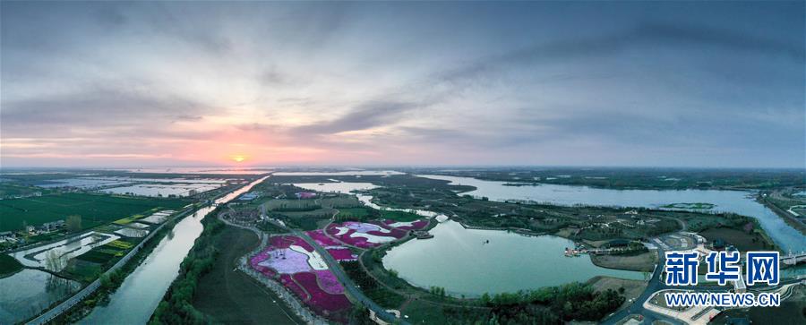这是4月6日拍摄的白马湖风光(无人机全景照片)。近日,江苏省淮安市白马湖畔春花绽放,景色怡人。白马湖地处淮河流域下游,东贯大运河,西倚洪泽湖,南北分别衔接淮河入江水道和入海水道,湖泊水域面积113平方公里,是全国15个生态良好重点保护湖泊之一。 新华社记者 杨磊 摄