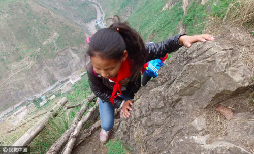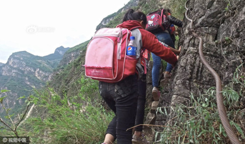 四川省凉山彝族自治州昭觉县支尔莫乡阿土勒尔村,是一座名副其实的“悬崖村”,72户人家居住在这里,处于美姑河大峡谷断坎岩肩斜台地,海拔1400多米,与地面垂直距离约800米。5月14日,放学路上,孩子们在攀爬藤梯。图片来源:视觉中国