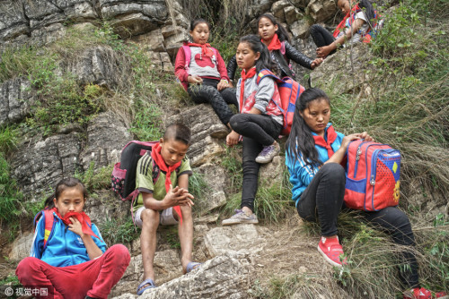 上学的孩子都背着沉沉的书包,大多数是女孩,15个孩子在三个家长的保护下,大约用了2个小时,到达“悬崖村”。上山容易下山难,遇到雨雪天气,村里人就不再外出了。图片来源:视觉中国