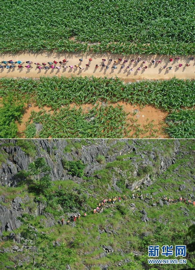 拼版照片:上图为在大化瑶族自治县板升乡弄勇村,孩子们走在放学路上(5月10日无人机拍摄);下图为在弄勇村弄顶屯,孩子们扛着生活用具,走山路回家(2012年7月4日摄)。新华社记者黄孝邦摄