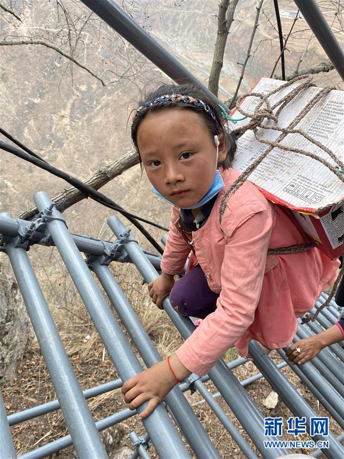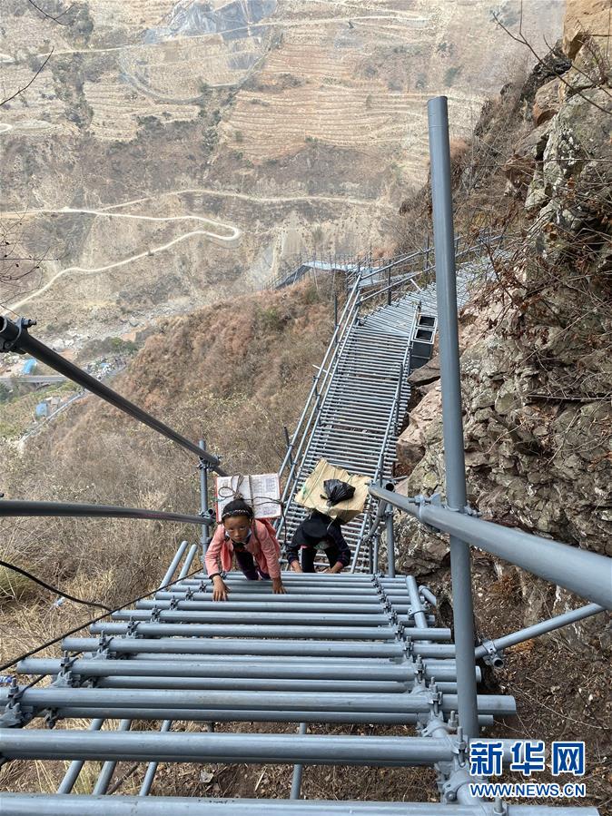 3月24日,村民背着背篓攀爬钢梯。新华社记者薛晨摄