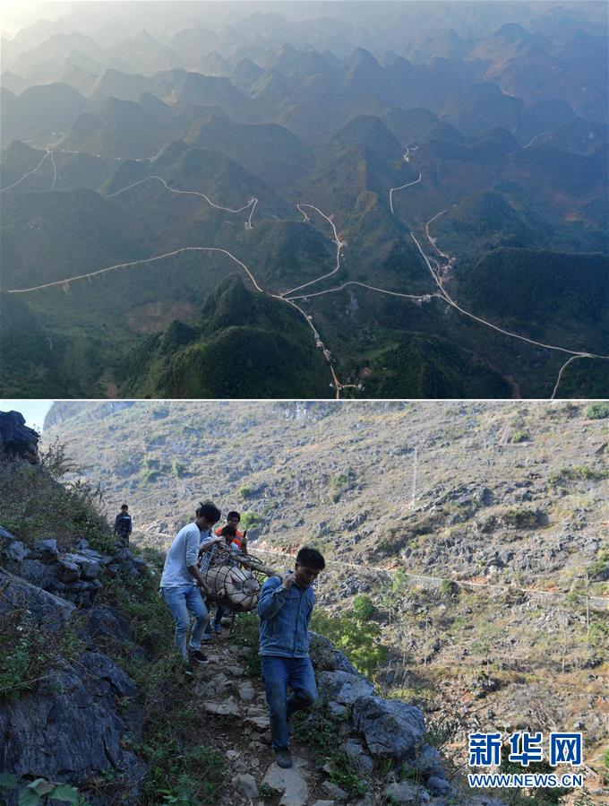 拼版照片:上图为刚刚修通公路的大化瑶族自治县板升乡八好村弄麻屯(11月11日无人机拍摄);下图为在尚未通路的八好村弄麻屯,孩子们爬山路回家(2016年9月23日摄)。新华社记者黄孝邦摄