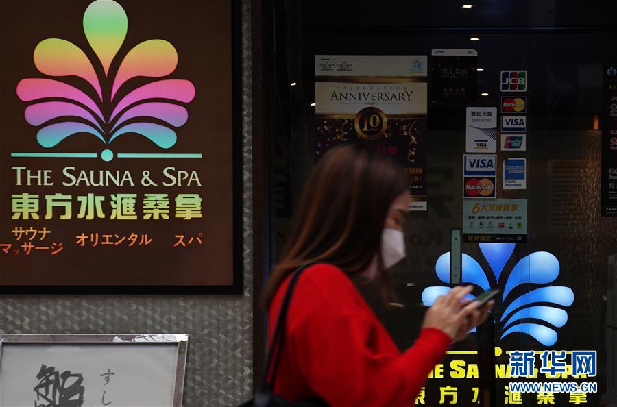 在香港街头,路人从一家暂停营业的桑拿浴室经过(4月8日摄)。 新华社记者 李钢 摄