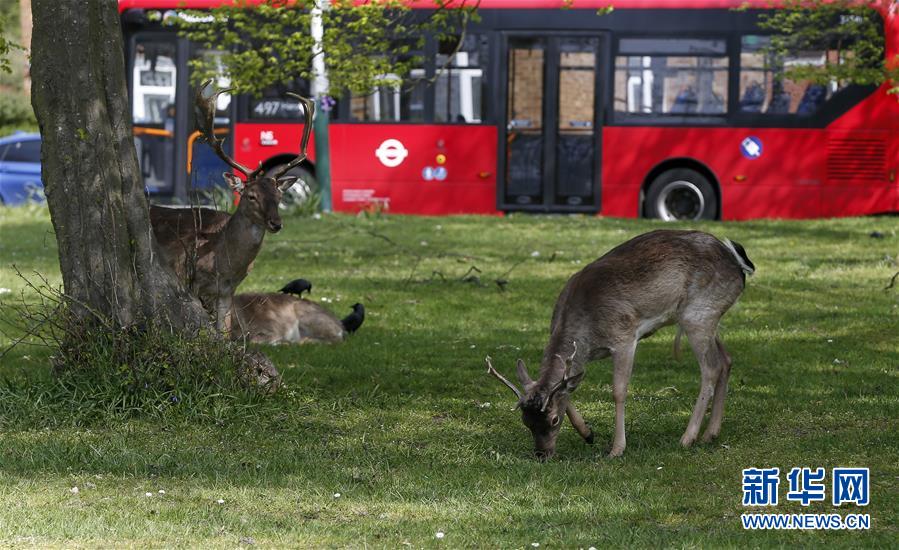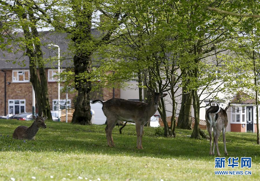 4月8日,在英国伦敦东部一个居民区,附近公园里的鹿在草坪上驻足。随着新冠疫情在英国的扩散,政府要求人们减少不必要的外出。伦敦东部一个居民区附近公园里原来散养的鹿纷纷从公园走出来,或吃草或接受附近居民的喂食,成为特殊时期居民区里的新“客人”。新华社记者韩岩摄