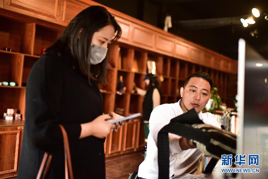 4月2日,克雷·朋措旺加在“希望之家”为顾客结算商品。新华社记者 吴刚 摄