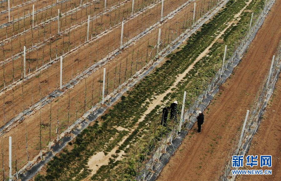 4月10日,在灵台县一矮化密植苹果基地内,工作人员在果园内劳作(无人机照片)。新华社记者 多蕾 摄