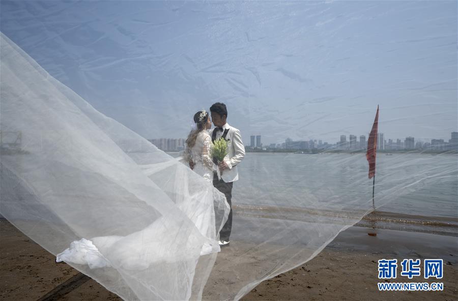 4月12日,骆舰和程熠爽(左)在长江边拍摄婚纱照。新华社记者费茂华摄