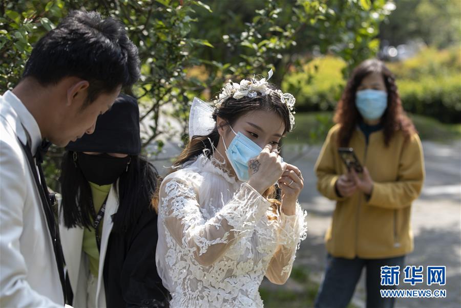 4月12日,骆舰(左一)和程熠爽结束在武汉江滩公园的拍摄后戴上口罩准备返回摄影工作室。新华社记者费茂华摄