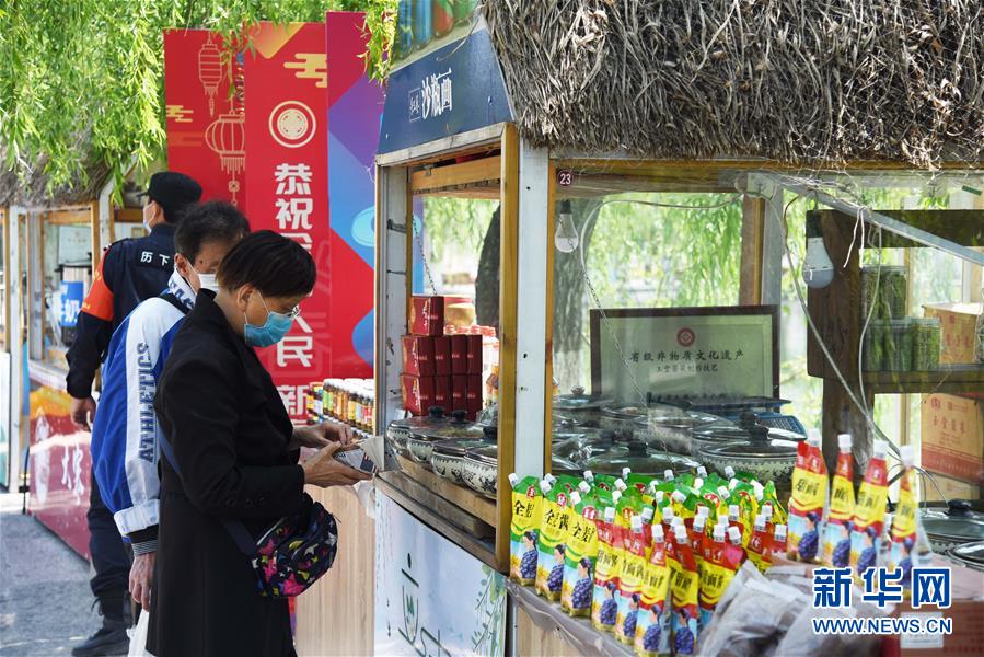 4月13日,游客在济南百花洲历史文化街区购买文创产品。新华社记者王凯摄