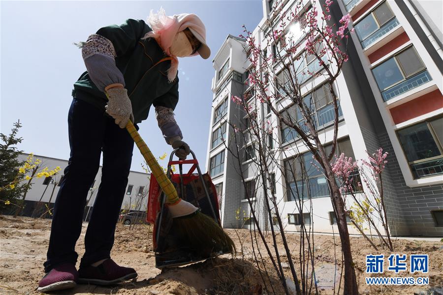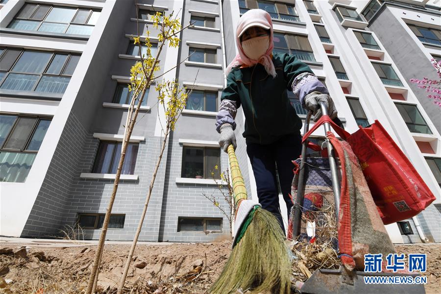 在古浪县绿洲生态移民小城镇,胥存打扫小城镇花园卫生(4月7日摄)。新华社记者范培珅摄