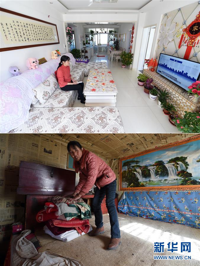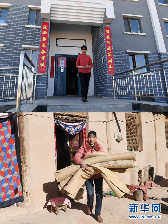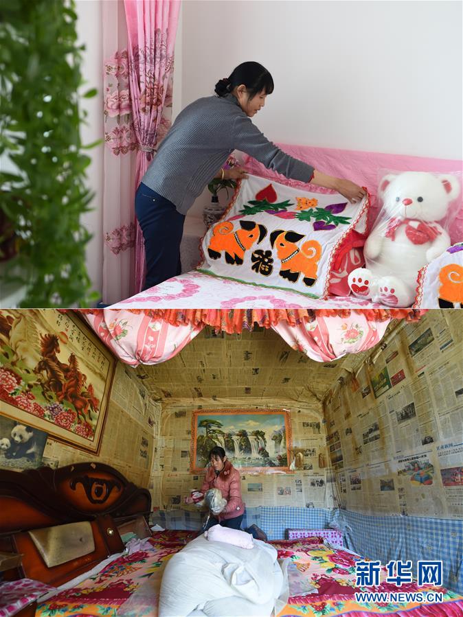 拼版照片:上图为胥存在古浪县绿洲生态移民小城镇整理家中卧室(4月7日摄);下图为胥存在古浪县黄羊川镇石城村收拾家中床上物品(2018年2月6日摄)。新华社记者范培珅摄