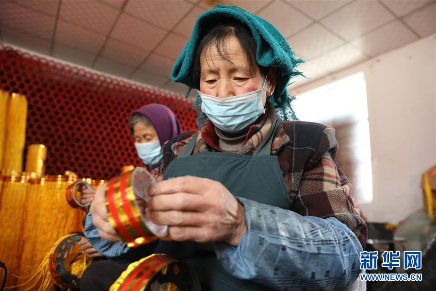 4月13日,在庄浪县水洛镇吊沟村“巾帼扶贫车间”,54岁的吊沟村村民唐莲珍在制作灯笼底座。新华社记者多蕾摄
