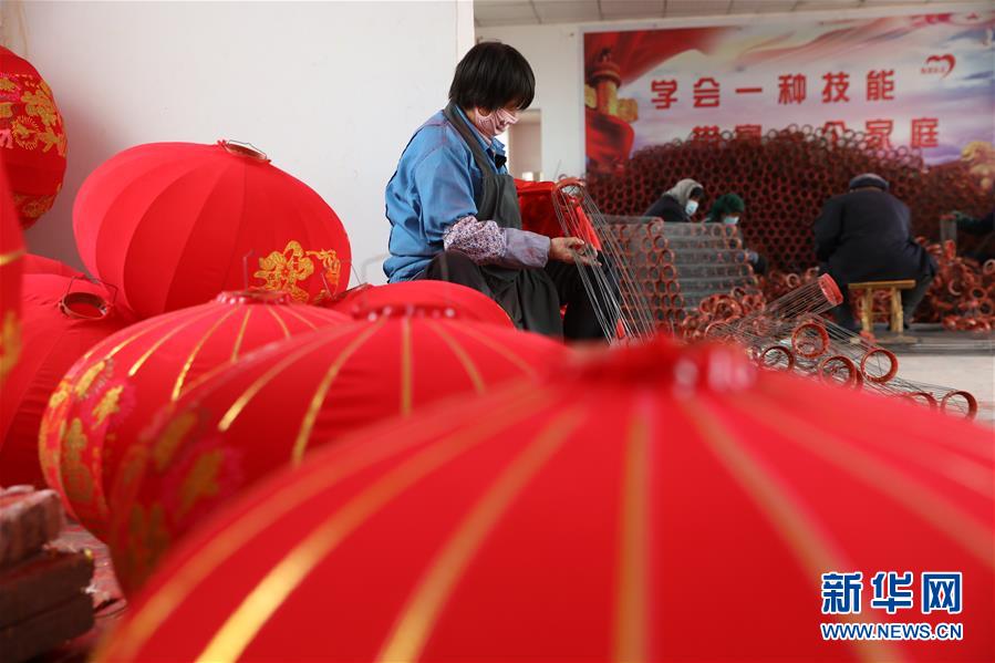 4月13日,在庄浪县水洛镇吊沟村“巾帼扶贫车间”,当地妇女在制作灯笼。新华社记者多蕾摄