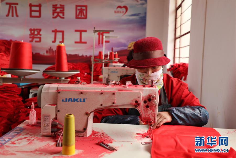4月13日,在庄浪县水洛镇吊沟村“巾帼扶贫车间”,车间工人郑改珠在缝制灯笼套。新华社发 (何问摄)