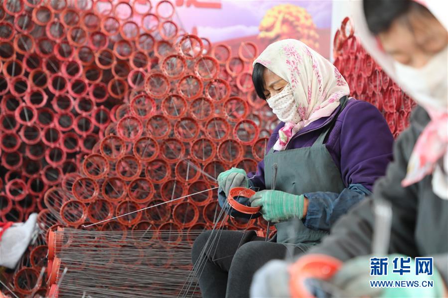 4月13日,在庄浪县水洛镇吊沟村“巾帼扶贫车间”,车间工人们在组装灯笼骨架。新华社发 (何问摄)