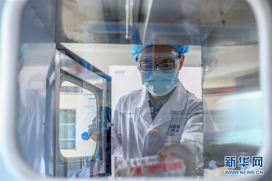 4月11日,工作人员在国药集团中国生物新冠疫苗生产基地质量检定部门从传递窗拿取新型冠状病毒灭活疫苗样品。记者4月14日从国务院联防联控机制科研攻关组获悉,我国两款新冠病毒灭活疫苗获得国家药品监督管理局一二期合并的临床试验许可,相关临床试验同步启动。这是首批获得临床研究批件的新冠病毒灭活疫苗。新华社记者张玉薇摄