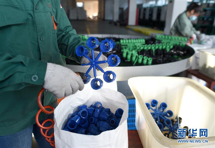 4月13日,员工在位于店口镇的诸暨市风帆管业有限公司注塑车间分拣自动化生产线上的管件。新华社记者韩传号摄