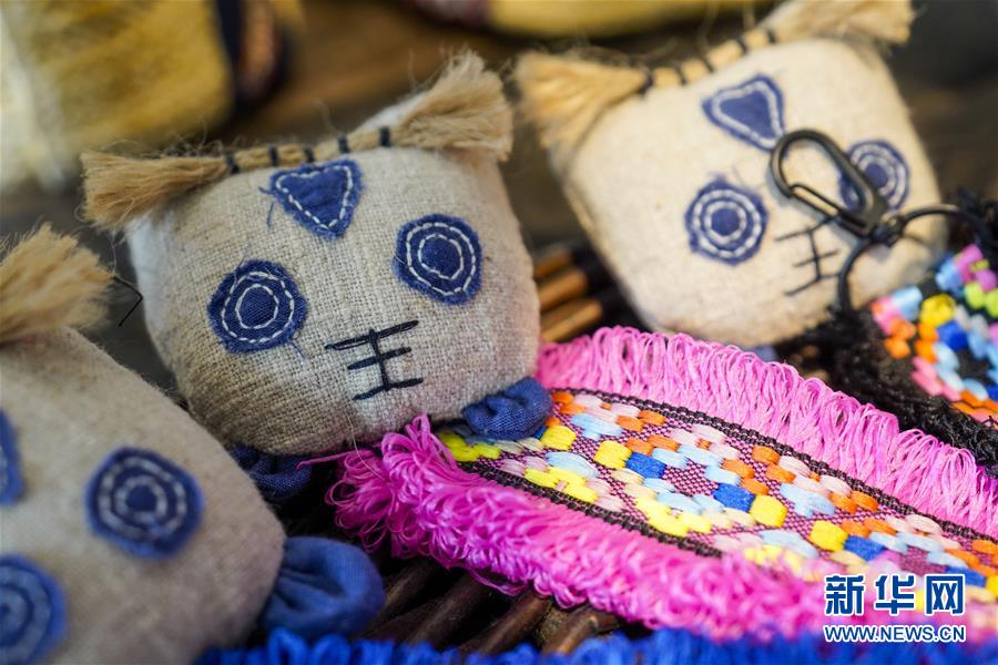 这是重庆石柱中益乡巾帼扶贫工坊内展示的当地妇女制作的土家族风情钥匙扣(4月8日摄)。近年来,重庆市石柱土家族自治县中益乡在重庆市妇联的帮助下,以当地非遗传统技艺作为结合点,把扶贫与扶志、扶智相结合,通过引进外来文创企业对留守妇女、贫困及残疾人群进行刺绣培训,设立巾帼扶贫工坊等多种形式,帮助当地村民实现就业增收。据介绍,巾帼扶贫工坊运行以来,为当地陆续开发出土家族布老虎、手提袋、餐垫绣边、创意相框等一系列文创产品,帮助参加巾帼扶贫工坊的留守妇女和贫困村民实现月均增收近千元。新华社记者刘潺摄