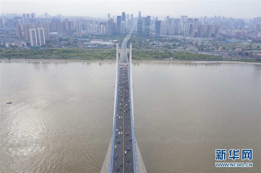4月14日,武汉长江二桥上车流如织(无人机照片)。随着疫情防控形势好转,武汉市内交通逐渐恢复,车辆日益增多。新华社记者才扬摄