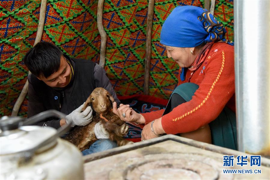 4月15日,转场牧民到达临时休息点,查看刚出生不久的羊羔身体情况。新华社记者丁磊摄