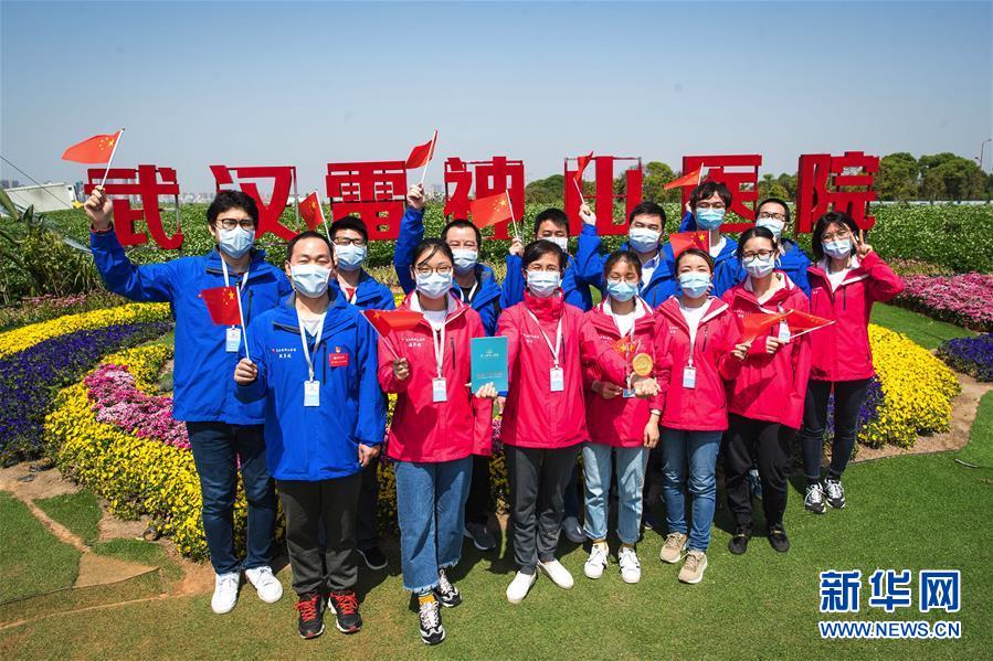 4月15日,武汉雷神山医院医护人员在休舱仪式上。当日,武汉雷神山医院正式关闭。新华社记者肖艺九摄