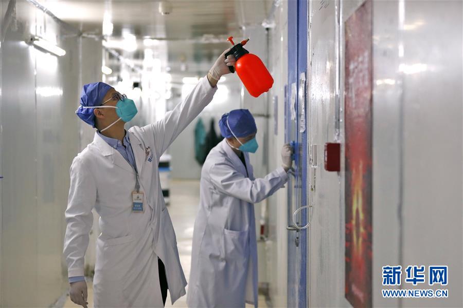 4月15日,医务人员在雷神山医院病区进行消杀。当日,武汉雷神山医院正式关闭。新华社记者沈伯韩摄