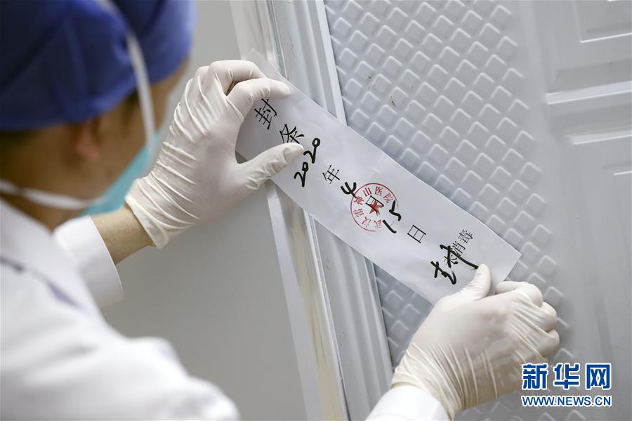 4月15日,医务人员在雷神山医院病区贴封条。当日,武汉雷神山医院正式关闭。新华社记者沈伯韩摄
