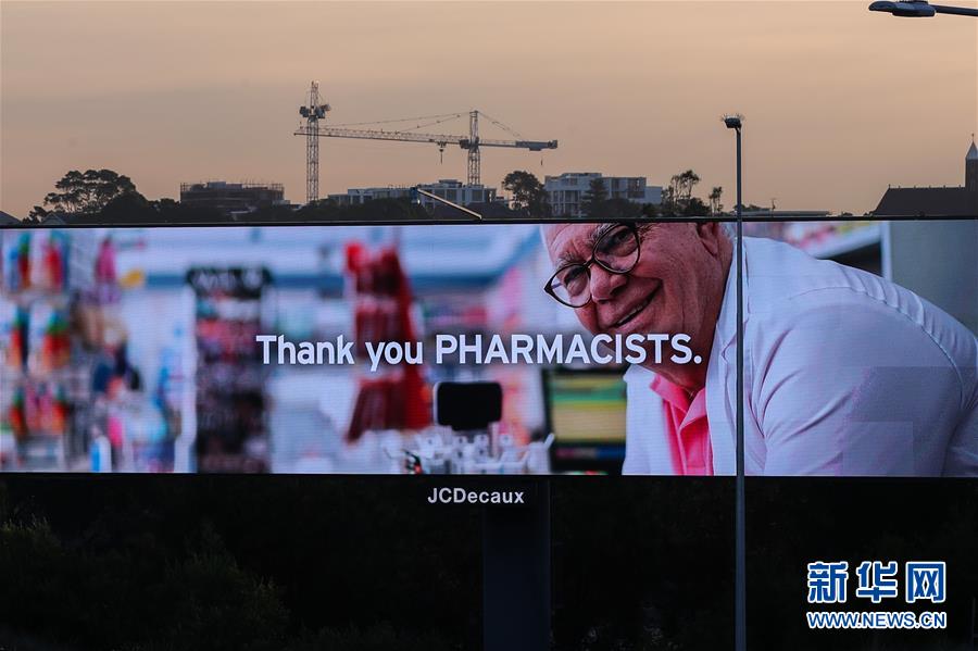 4月15日,在澳大利亚悉尼,户外广告牌上打出“感谢药剂师”的字样,感谢在疫情期间工作的人们。