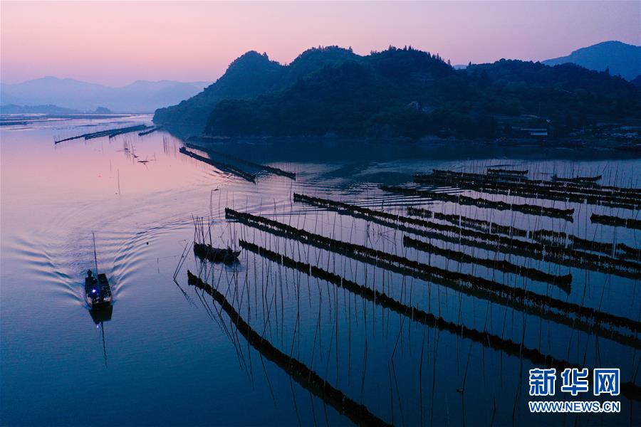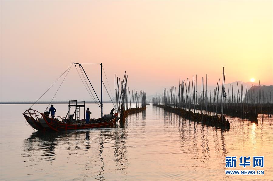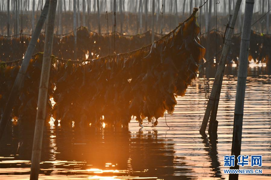 4月16日,福建省霞浦县长春镇渔民在日出时分晾晒海带。