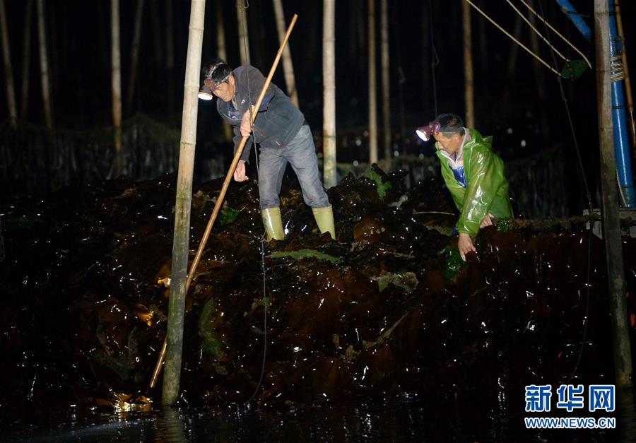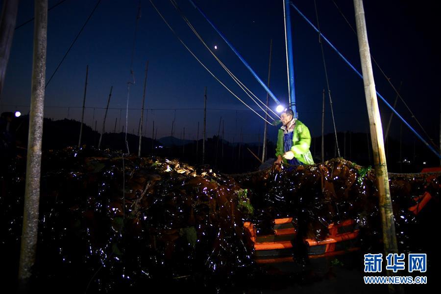 4月16日,福建省霞浦县长春镇渔民在收海带。