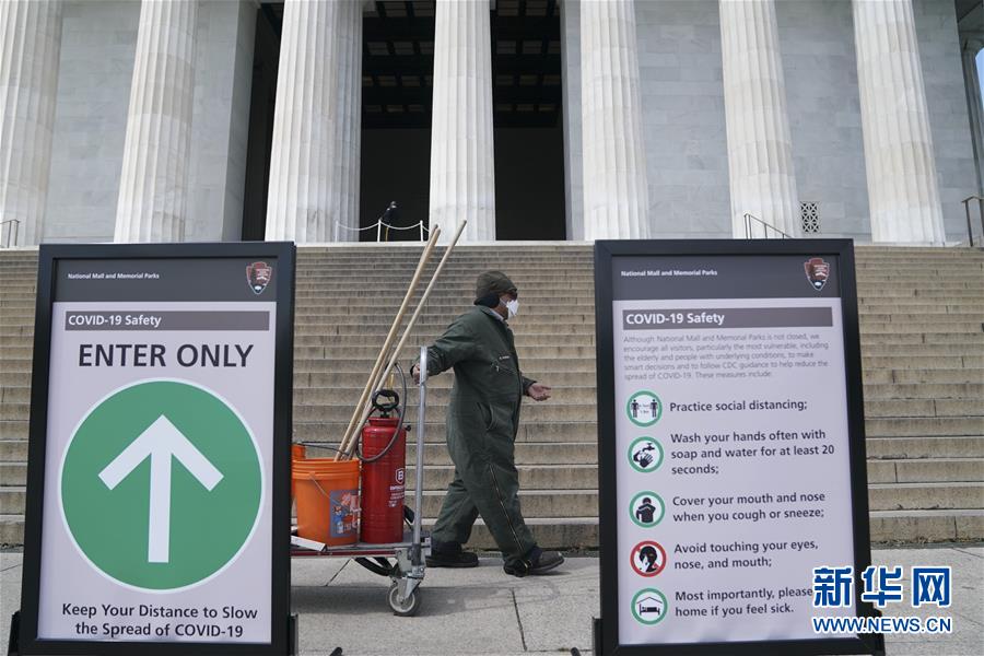 4月16日,在美国首都华盛顿林肯纪念堂前,一名清洁人员走过新冠疫情提示牌。美国约翰斯·霍普金斯大学16日发布的新冠疫情最新统计数据显示,截至美国东部时间16日16时(北京时间17日4时),美国新冠确诊病例升至653825例,死亡病例达30998例。新华社记者刘杰摄