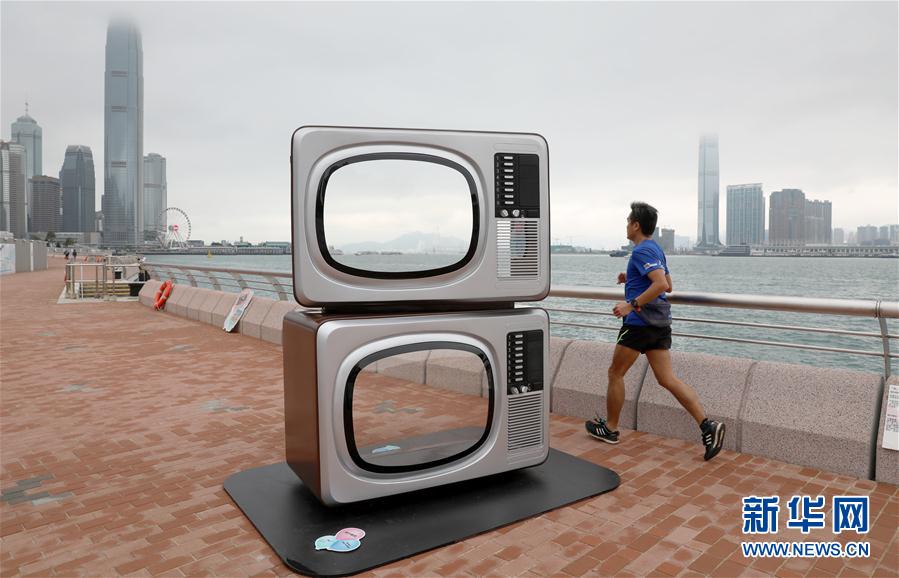 维多利亚港矗立的“电视机”装置展品(4月4日摄)。